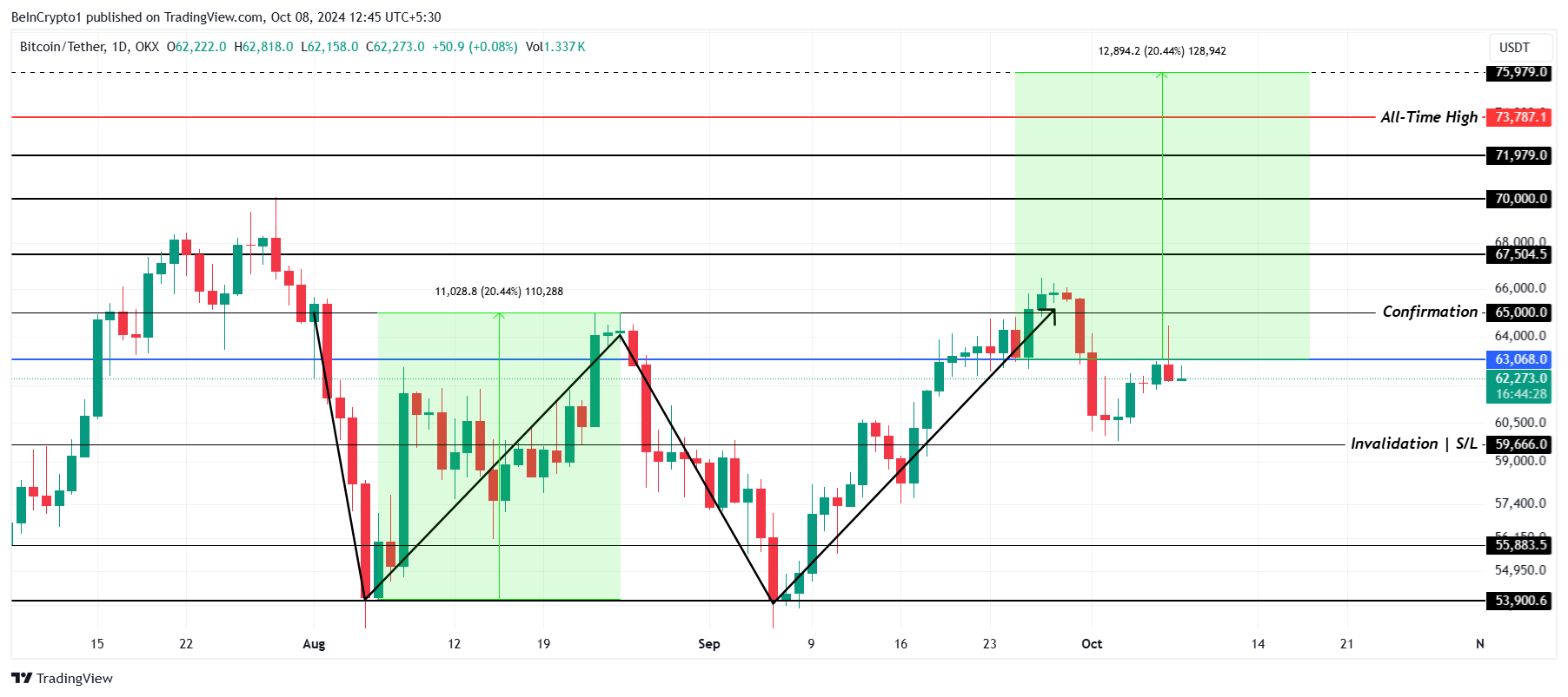 De factoren die institutionele interesse en de accumulatie door langetermijnhouders stimuleren, wijzen erop dat Bitcoin mogelijk een nieuwe poging tot een rally maakt. Dit zou worden bevestigd als BTC de weerstand van $63.068 doorbreekt en $65.000 omzet in steun. Zo’n beweging zou de volgende stap omhoog kunnen triggeren en de bullish verwachting verder versterken.