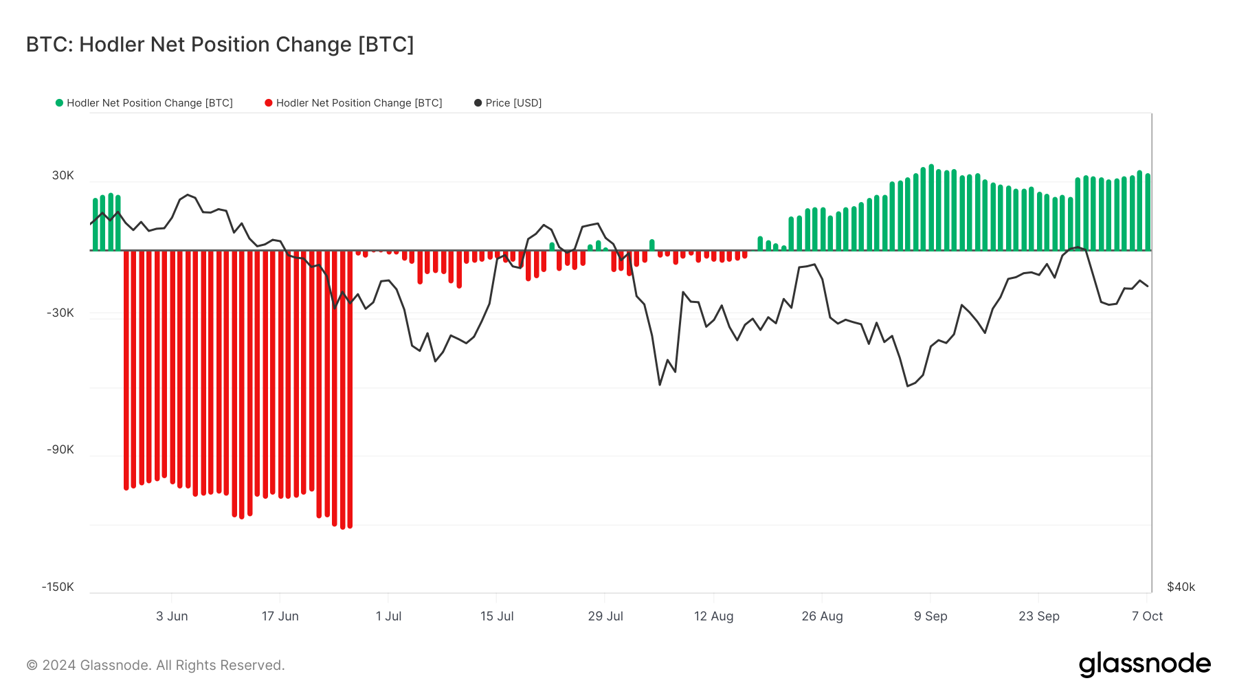 Daarnaast tonen langetermijnhouders (LTH’s) aanhoudend sterke overtuiging in Bitcoin, wat het macro momentum verder versterkt. De Hodler Net Position Change-indicator heeft sinds half augustus positieve cijfers laten zien, wat aangeeft dat LTH’s in een accumulatiefase zitten. Deze trend zet zich voort, met recente gegevens die laten zien dat LTH’s hun posities blijven vergroten, wat bijdraagt aan de algehele kracht van Bitcoin.