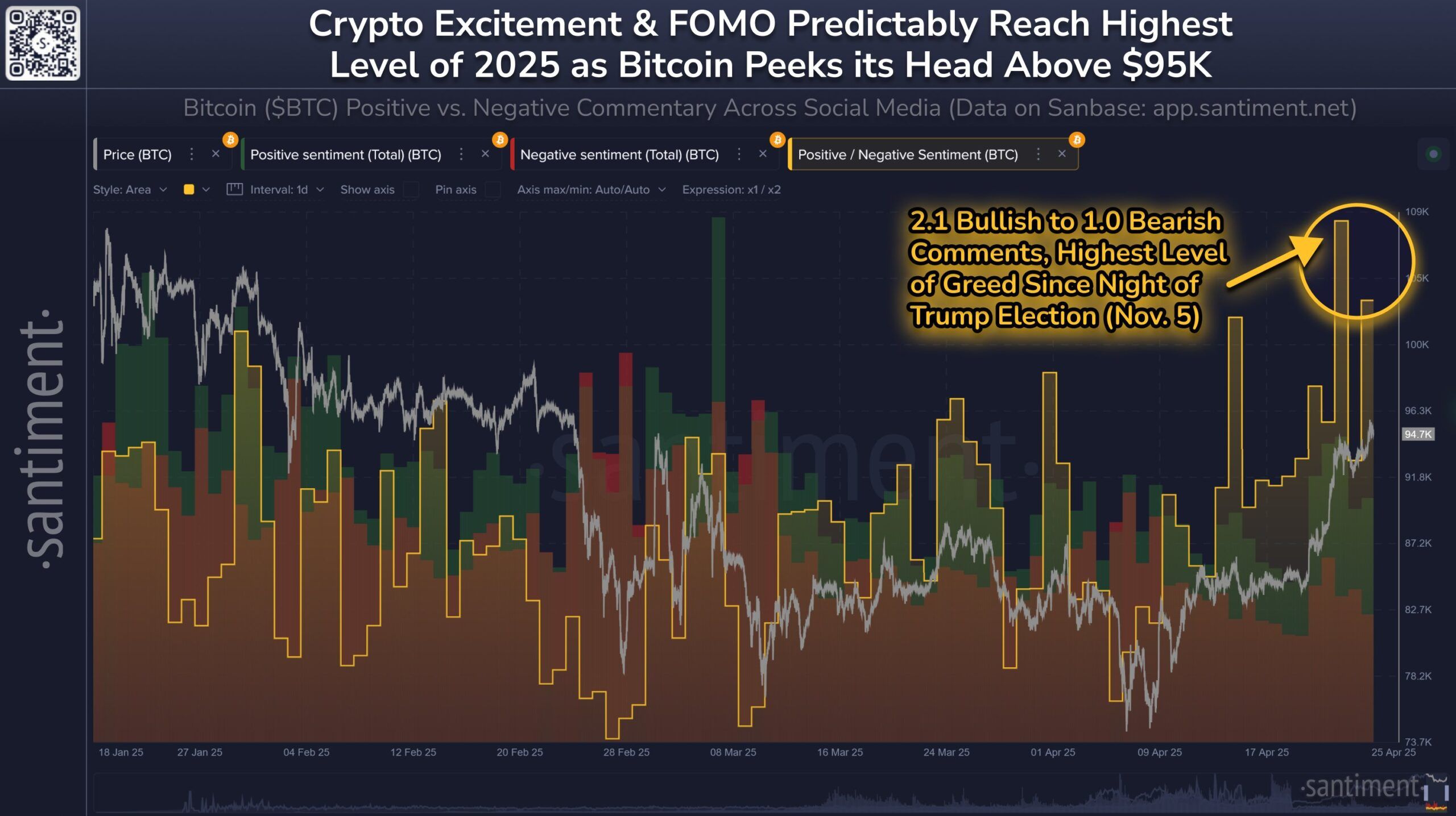 Het marktsentiment rondom Bitcoin blijft sterk positief, met investeerders die optimisme tonen over verdere koersstijgingen. Berichten op sociale media wijzen op een scherpe toename van bullish sentiment, met het aantal optimistische berichten dat vergelijkbare niveaus bereikt als de nacht van Donald Trump’s verkiezing op 5 november 2024. Deze golf van positiviteit duidt erop dat veel investeerders klaar zijn om te profiteren van Bitcoin’s potentiële groei, wat de rally verder versterkt.