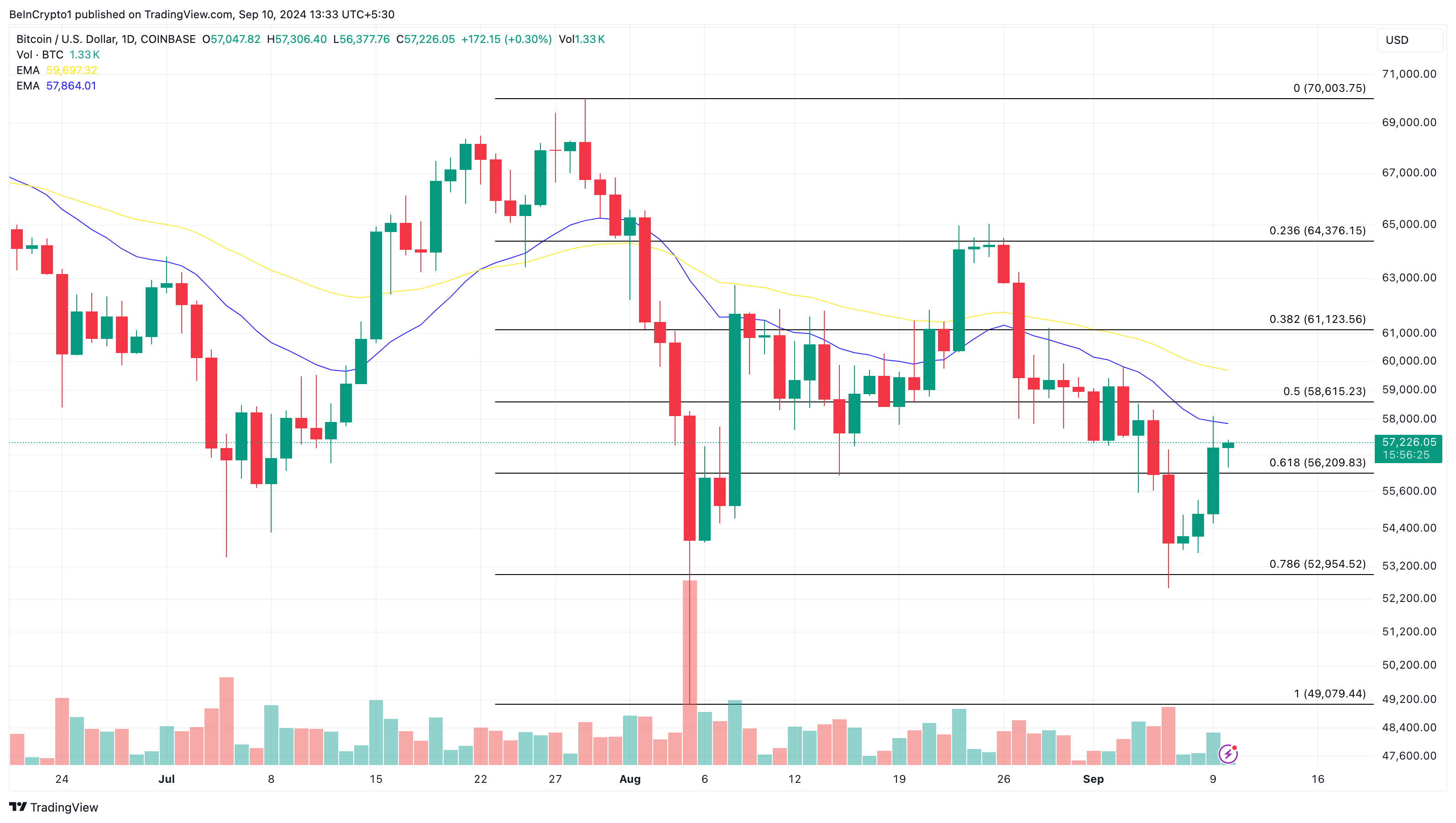 Op het moment van schrijven staat Bitcoin op $57.226. Hoewel de markt optimistisch is over een mogelijke voortzetting van de stijging, wijst on-chain analyse erop dat BTC mogelijk eerst nog een laatste dip zal maken voordat een rally kan beginnen die het hele laatste kwartaal van dit jaar zou kunnen aanhouden.