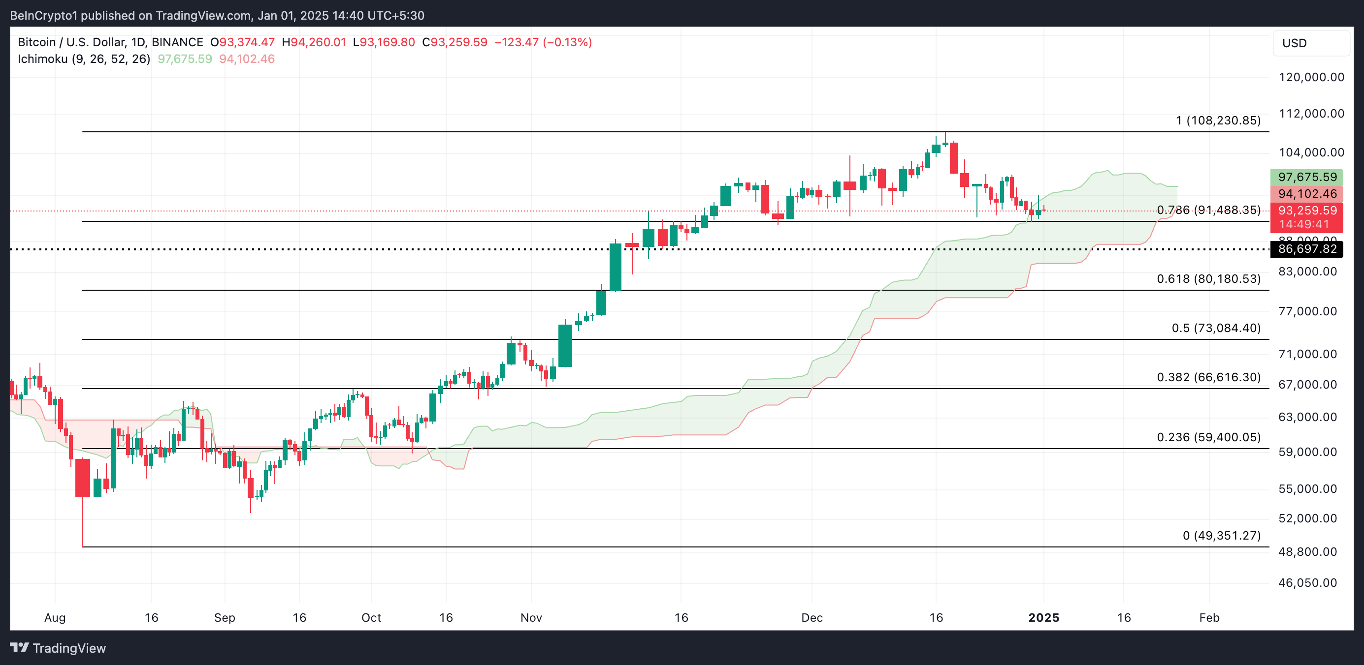 Echter, als BTC een opleving in koopactiviteit ervaart, kan dit de koers boven de dynamische weerstand van $97.675 brengen, aangeboden door de Leading Span A van zijn Ichimoku Cloud. Een succesvolle doorbraak van dit niveau kan de BTC-koers naar zijn all-time high van $108.230 drijven.