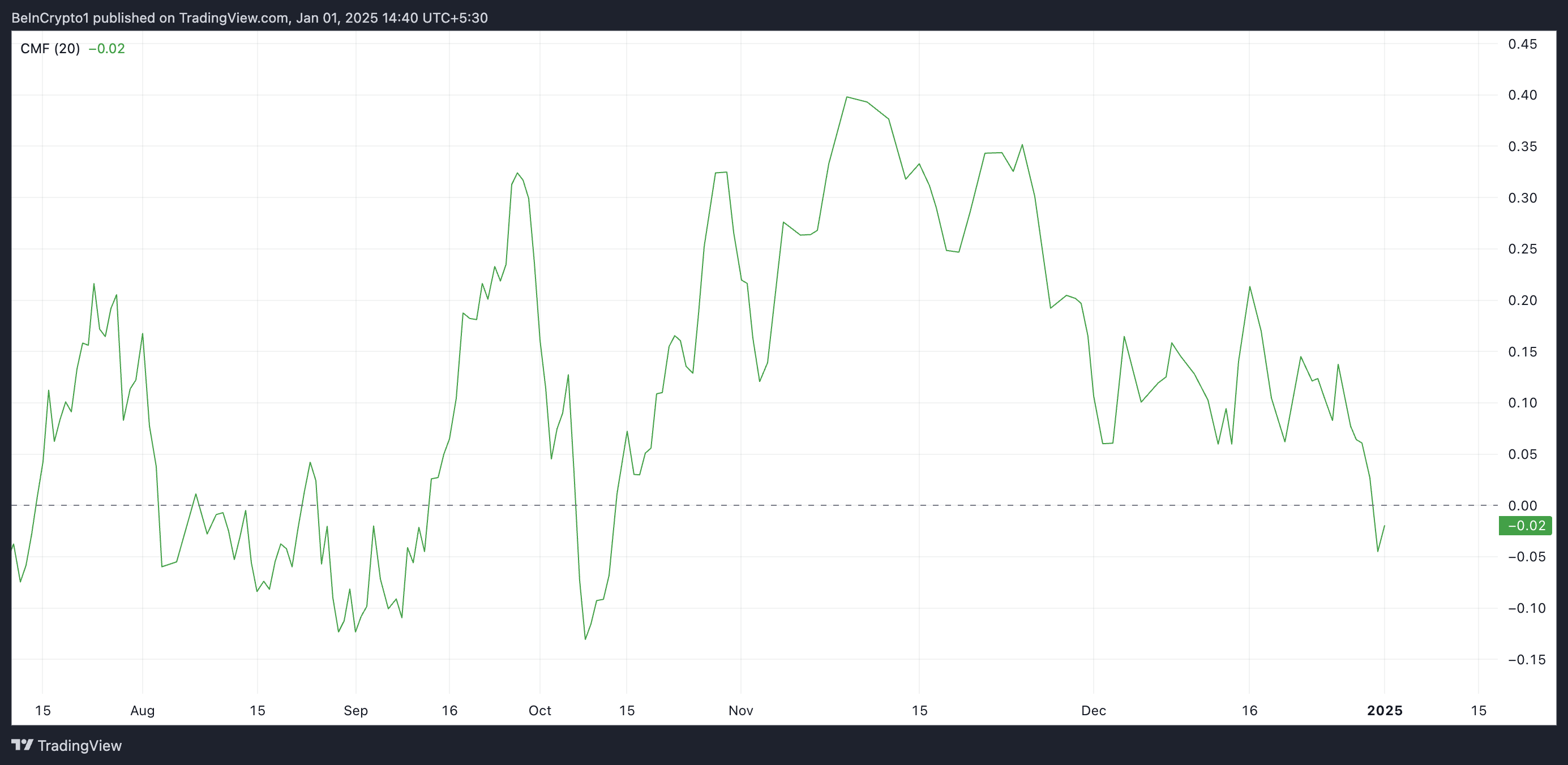 Gebaseerd op koers en volume meet de CMF-indicator de sterkte van de geldstroom in of uit een asset over een specifieke periode. Net als bij BTC, wanneer de waarde onder nul valt, duidt dit erop dat verkoopdruk domineert, wat suggereert dat er meer geld uitstroomt dan instroomt. Dit is een bearish signaal dat wijst op afnemende vraag en mogelijke neerwaartse koersbeweging.