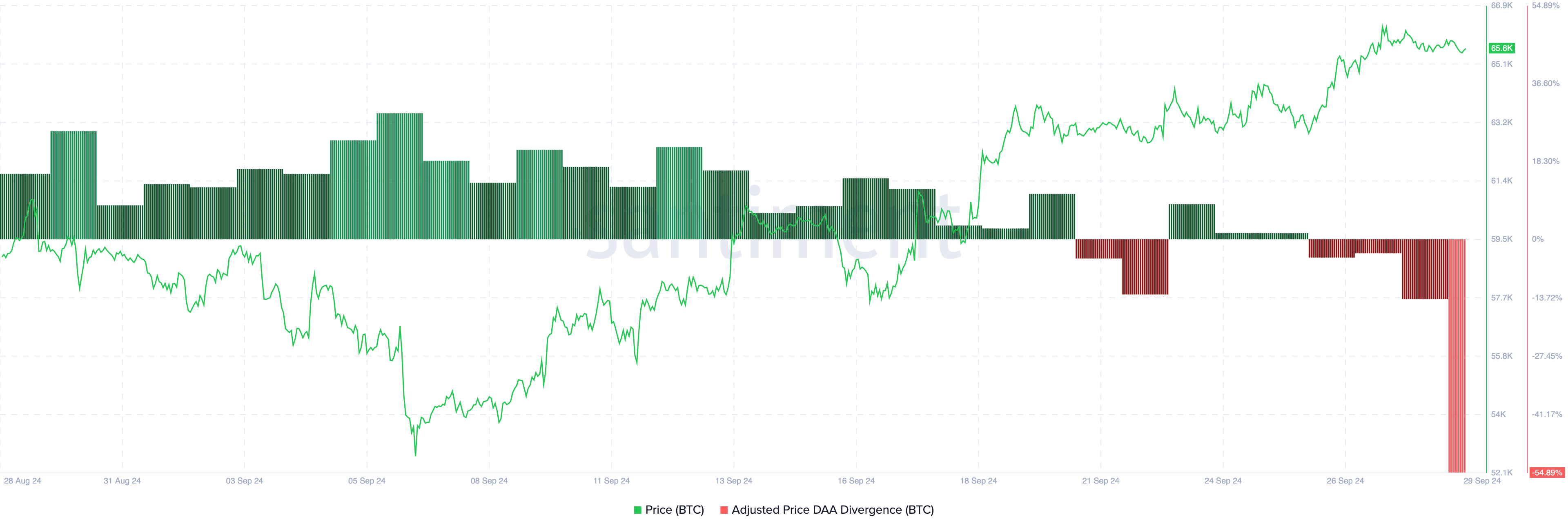 De stijging van de Bitcoin koers naar $65.497 heeft de verwachtingen van investeerders aan het begin van september, toen een bearish maand werd voorspeld, tegengesproken. Echter, op basis van de DAA (Daily Active Addresses) divergentie, bestaat de mogelijkheid dat BTC eerst zal dalen voordat het een poging doet om $70.000 opnieuw te testen.