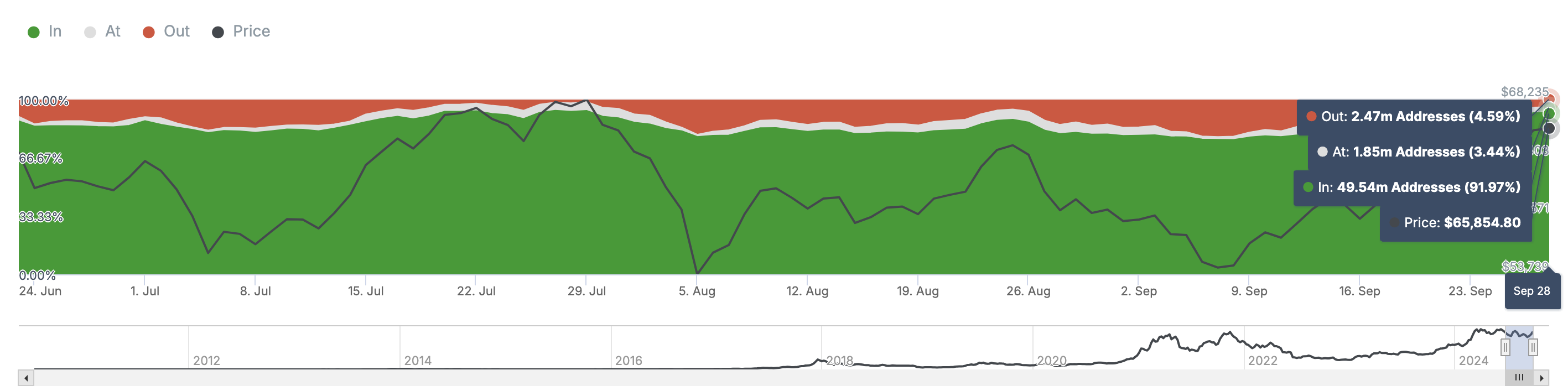 Daarnaast heeft de recente prestatie van Bitcoin de winstgevendheid van houders vergroot. Op 16 september was 79,92% van de Bitcoin-houders in het geld. Op basis van de Historical In/Out of Money (HIOM), die adressen analyseert die winst maken bij verschillende koersniveaus, is dit percentage nu gestegen naar 91,97%.