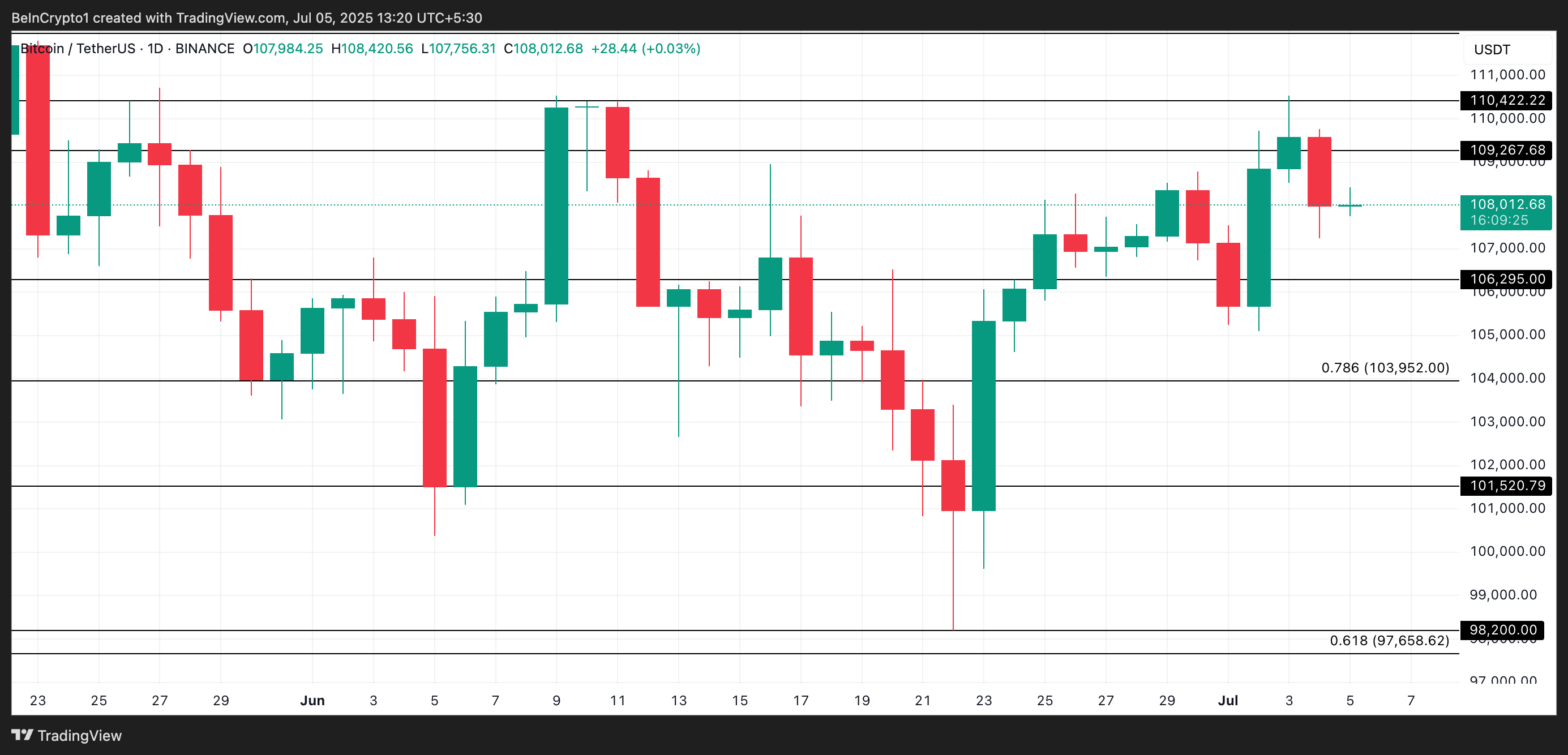 Na te hebben geprobeerd te herstellen van de bearish impact, handelt de coin momenteel op $108.196, nog steeds 1% lager in de afgelopen 24 uur.