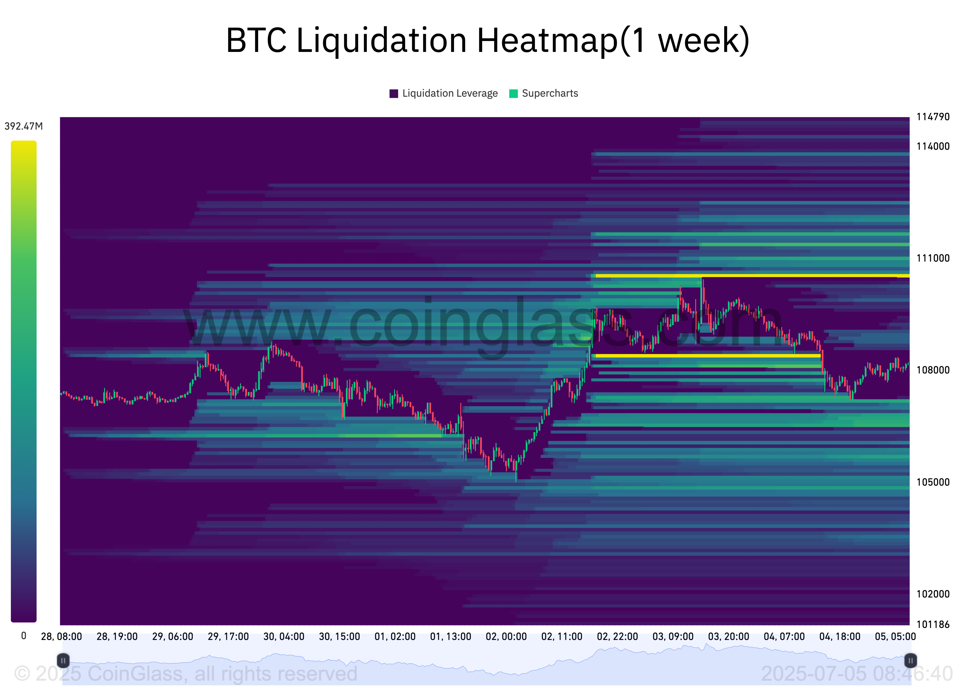In het geval van BTC signaleert de liquiditeitscluster rond het $110.567 niveau sterke interesse van handelaren om te kopen of shortposities af te dekken op dat koersniveau. Deze setup zou een korte-termijn rally kunnen aandrijven als bullish momentum de verkoopdruk op de BTC-spotmarkten overtreft.