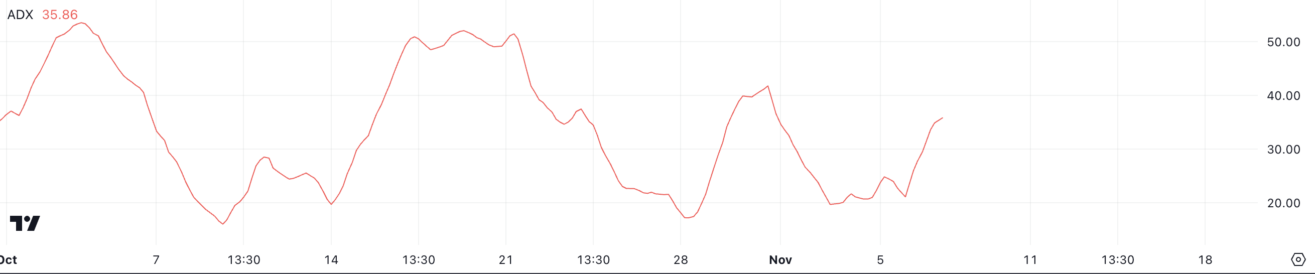 Als deze boven 40 uitkomt, is de trend zeer sterk. Momenteel staat de ADX van Bitcoin op 35,86, wat aangeeft dat Bitcoin zich in een solide uptrend bevindt en binnenkort nieuwe all-time highs zou kunnen bereiken.