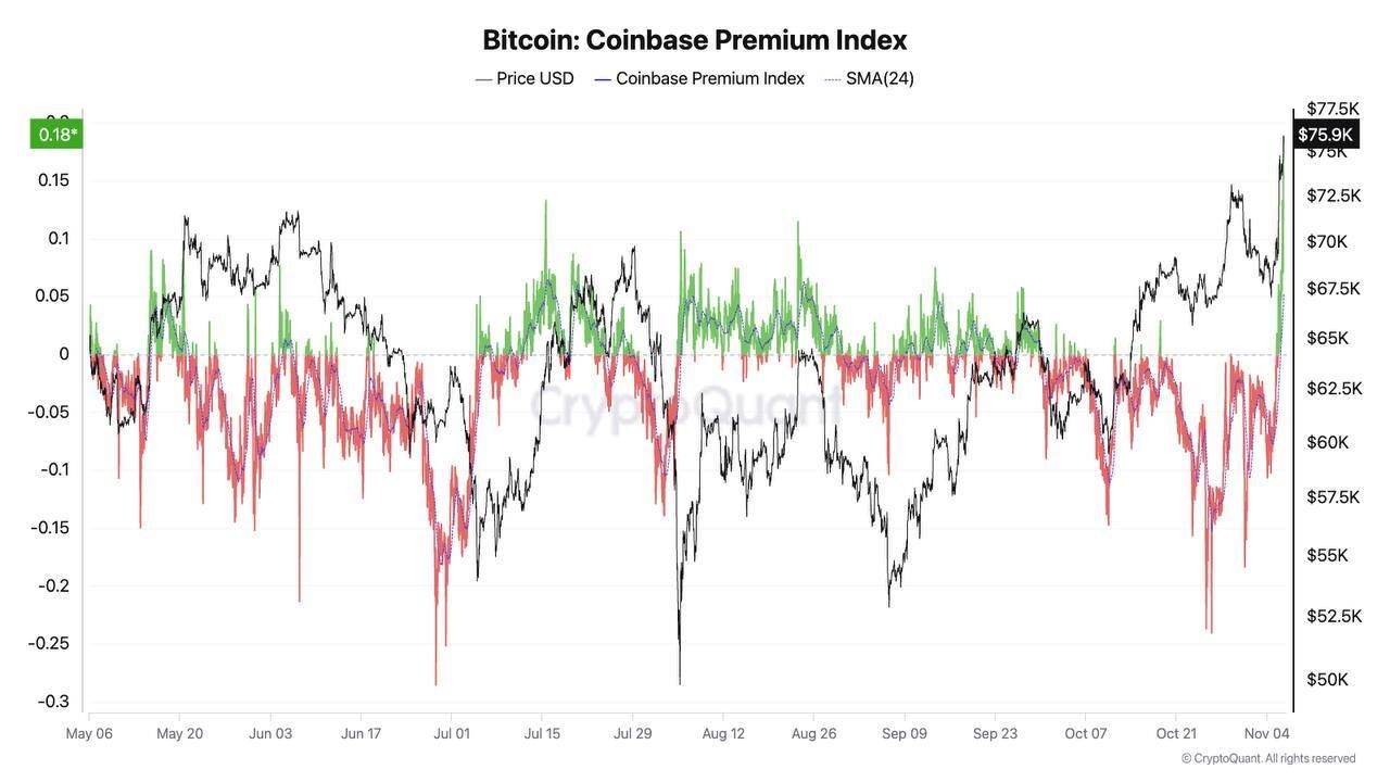De Bitcoin (BTC) koers heeft onlangs een nieuwe all-time high bereikt na de verkiezing van Donald Trump als president van de VS. Deze vraagstijging lijkt gedreven te zijn door hernieuwde interesse van Amerikaanse investeerders, zoals blijkt uit de aanzienlijke stijging van de Coinbase Bitcoin Premium Index.