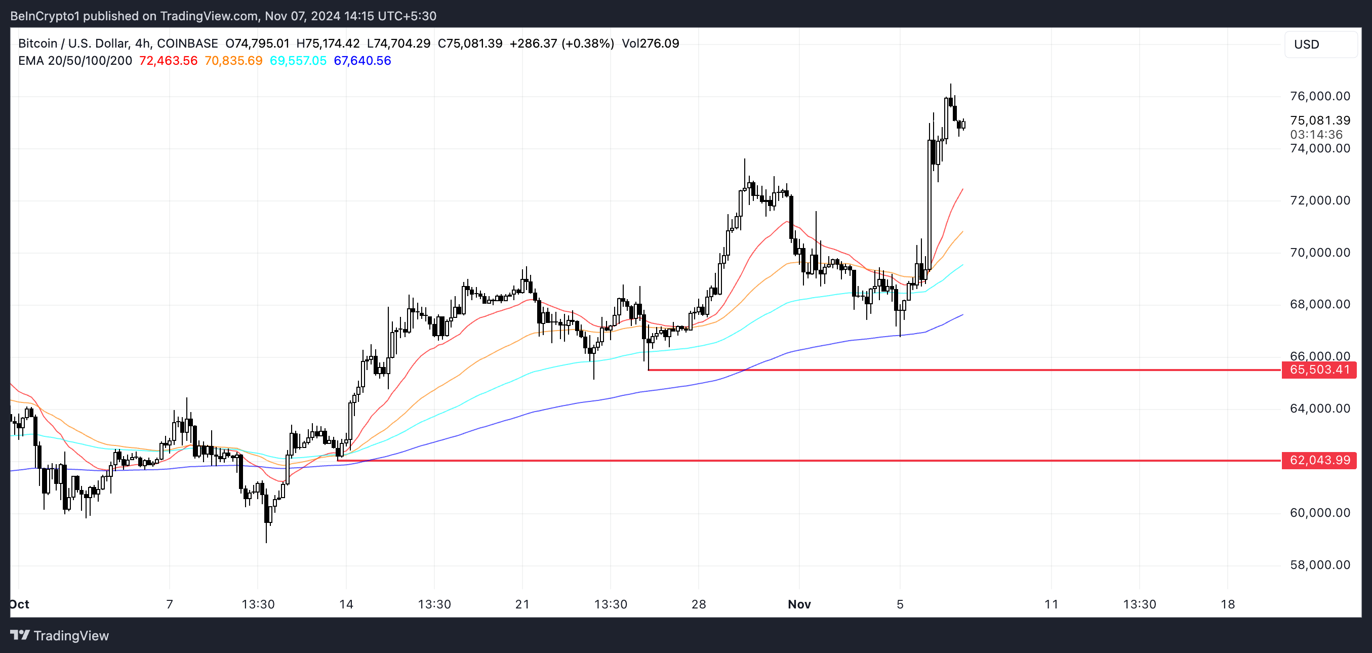 De EMA-lijnen van Bitcoin tonen momenteel een bullish opstelling. Zelfs na het bereiken van een nieuwe all-time high, is de koers iets teruggevallen maar blijft positief.