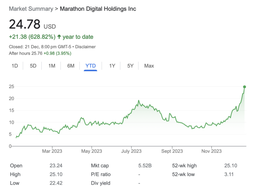 Marathon Digital’s aandelen zijn sinds 1 januari met 628,82% gestegen. De huidige koers staat op $24,78 op het moment van publicatie.
