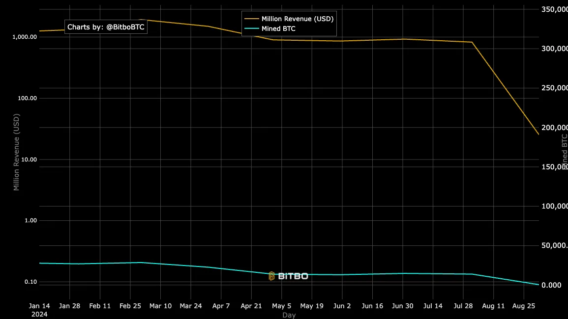 Bitcoin (BTC) miners hebben in augustus een aanzienlijke terugval meegemaakt, waarbij hun maandelijkse inkomsten zijn gedaald tot het laagste niveau sinds het begin van het jaar.