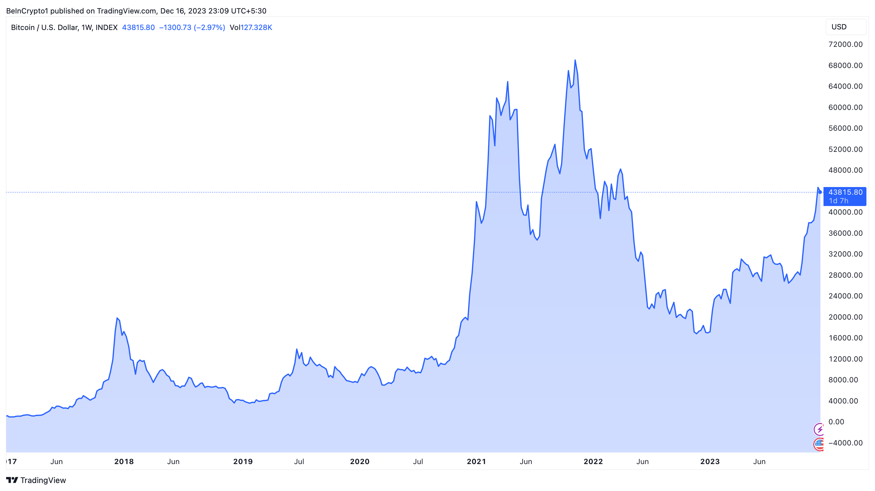 De reis van Bitcoin weerspiegelt die van een wonderkind dat in het zicht opgroeit. Beginnend bij $3.000 in 2017 is de waarde omhoog geschoten, wat getuigt van veerkracht en een onmiskenbare aantrekkingskracht op investeerders.