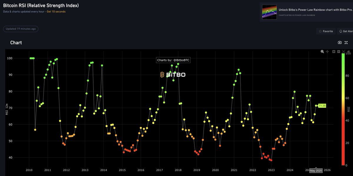 Op het huidige niveau bevindt Bitcoin zich in een licht “overbought” zone, maar heeft nog ruimte om te groeien vergeleken met historische pieken. BTC bereikt meestal zijn piek wanneer de RSI de 90-grens overschrijdt.