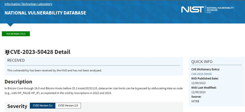 De bezorgdheid ontstond toen Bitcoin core-ontwikkelaar Luke Dashjr het beschreef als een “kwetsbaarheid” die de blockchain spamt. Dashjr onthulde later dat de zorgen over de bug zijn opgenomen in de Amerikaanse National Vulnerability Database als CVE-2023-50428.