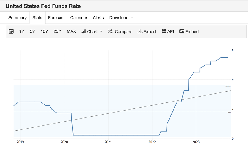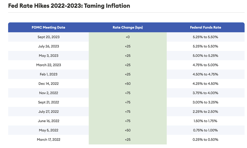 SponsoredIn een reactie op de hoge inflatie verhoogde de FED de rente geleidelijk met 525 basispunten. Dit gebeurde over een periode van 16 maanden die teruggaat tot maart 2022.