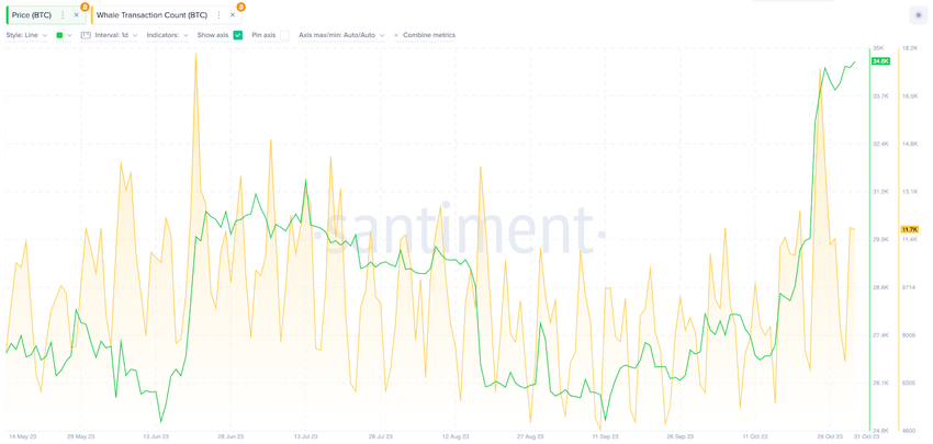 De grafiek hieronder laat zien dat Bitcoin in elk van de laatste 10 dagen ten minste 7.000 bevestigde whale-transacties heeft aangetrokken. Dit gaat terug tot 22 oktober.