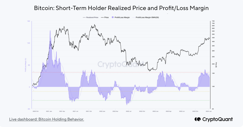 De screenshot hieronder laat zien dat de ongerealiseerde winsten van Bitcoin korte-termijn holders zijn toegenomen.