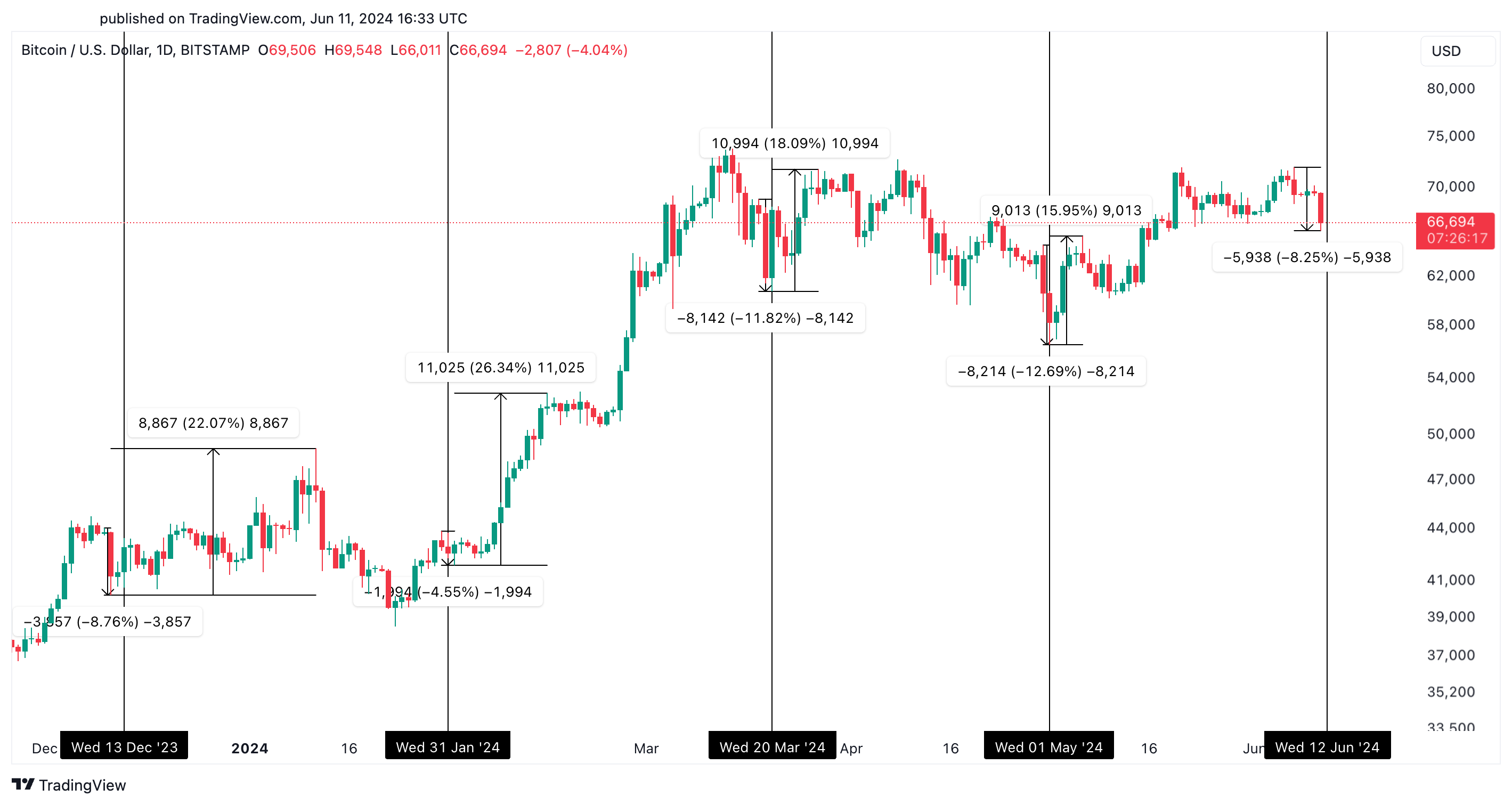Historische data van recente vergaderingen geven aan dat de waarde van Bitcoin meestal daalt voor de rentebesluiten van het FOMC, gevolgd door sterke stijgingen na de aankondiging.