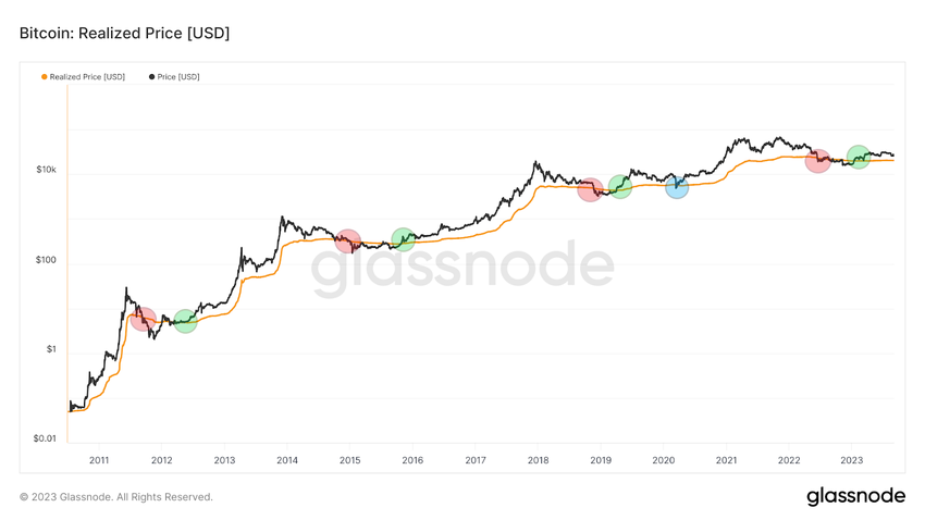 De enige uitzondering is maart 2020, toen de prijs van BTC ook sterk daalde door de COVID-19-crash op de wereldwijde markten. Daarna maakte de grootste cryptocurrency een bullish hertest van de gerealiseerde prijs (blauwe cirkel). Dit moment bleek een uitstekende koopkans.