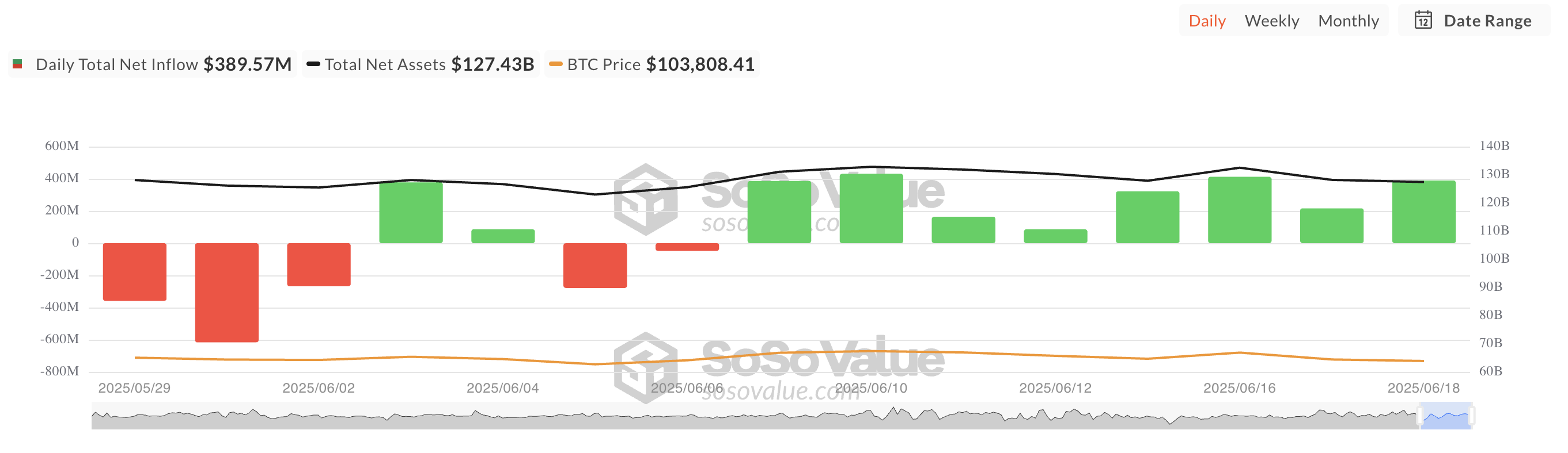 Totale Bitcoin spot ETF netto-instroom. Bron: SosoValue