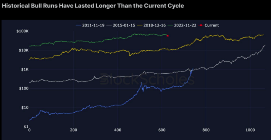 Deze cyclus begon toen Bitcoin herstelde van de post-FTX low van $15.800 in november 2022. Tot op heden heeft BTC 624 dagen in deze bull run gemarkeerd, met een piek van $73.000 in maart 2024, wat meer dan een verviervoudiging van zijn dieptepunt vertegenwoordigt.