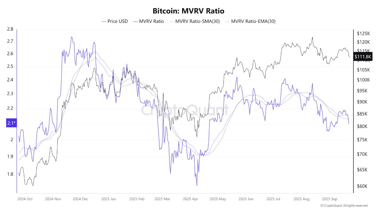 Analist XWIN Research Japan merkte op dat de Market Value to Realized Value (MVRV)-ratio van Bitcoin rond een neutrale waarde van 2,1 ligt. Dit niveau geeft aan dat investeerders zich momenteel niet in grote verliezen en ook niet in uitzonderlijke winsten bevinden.