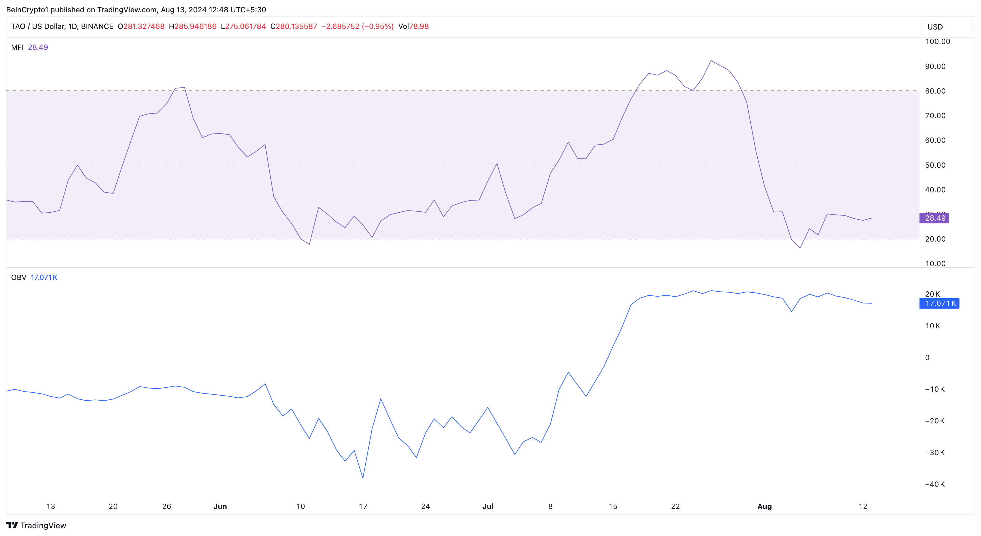 Op dit moment handelt TAO op $278,93, wat een daling van 15% betekent in de laatste vier dagen. Volgens de dagelijkse grafiek zijn de Money Flow Index (MFI) en de On Balance Volume (OBV) ongeveer op dezelfde plek gebleven sinds de daling begon.