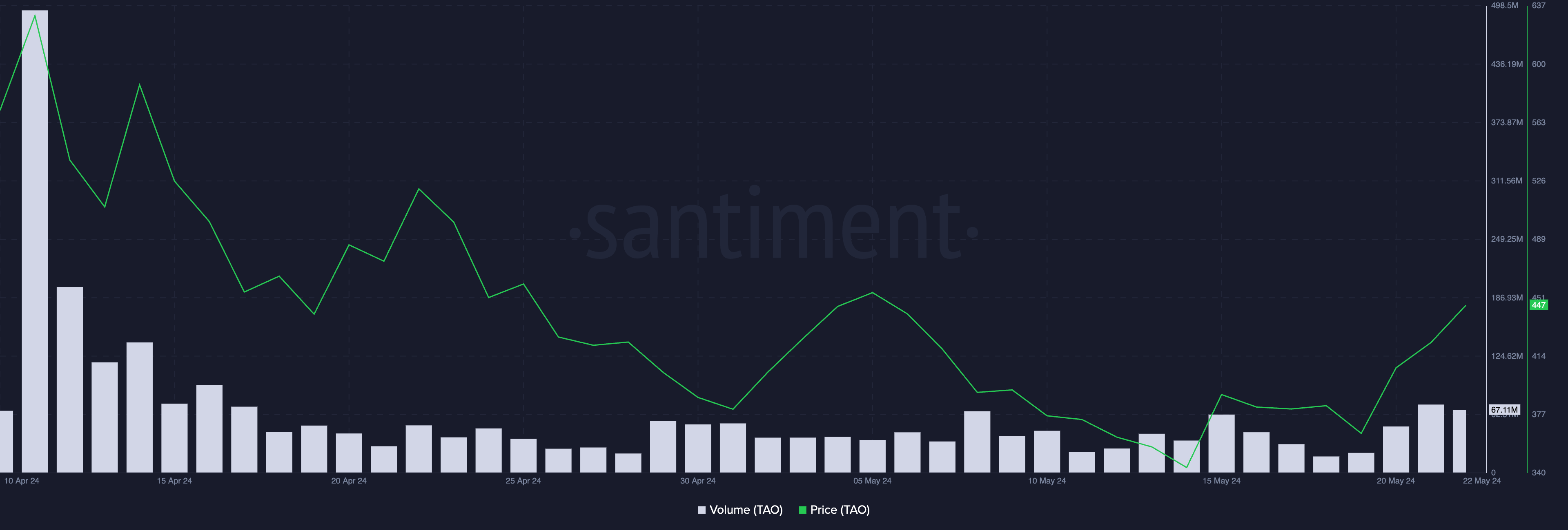 Er was ook een sterke sprong in het dagelijkse trading volume. Met $83,2 miljoen is het dagelijkse handelsvolume van TAO het hoogste sinds 11 april.