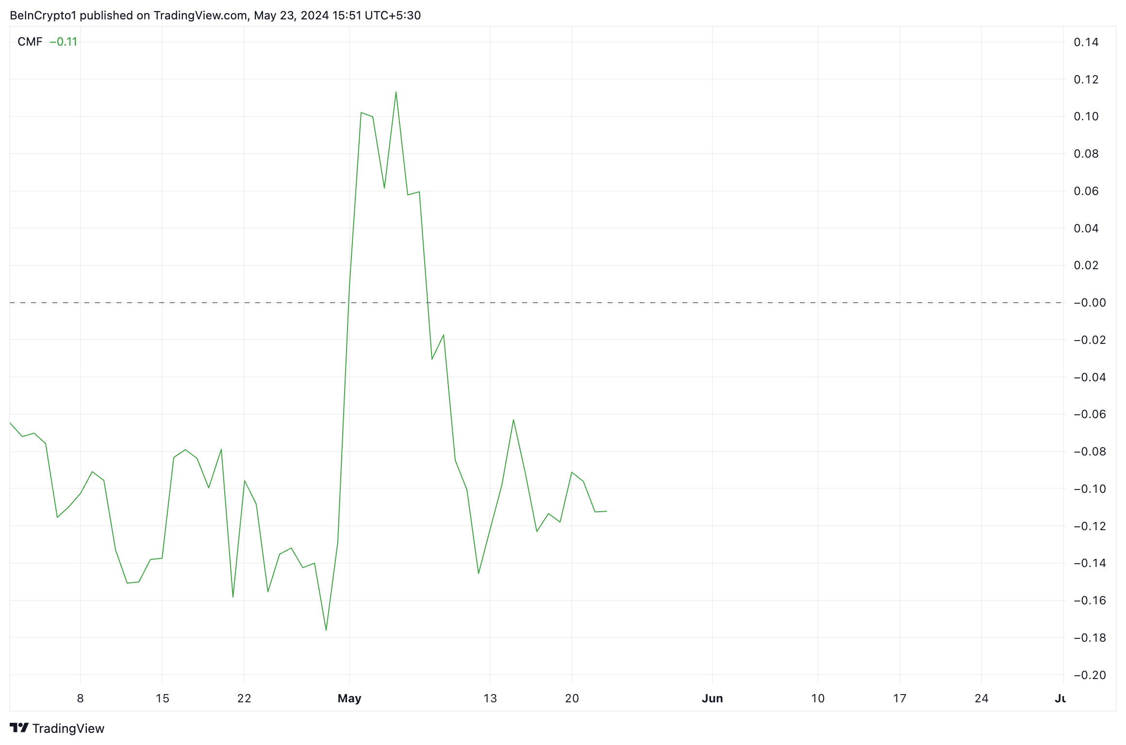 Maar ondanks de groei van de koers van de token, is zijn Chaikin Money Flow (CMF) gedaald. De waarde van deze belangrijke indicator lag voorheen onder de middelste nullijn op -011.