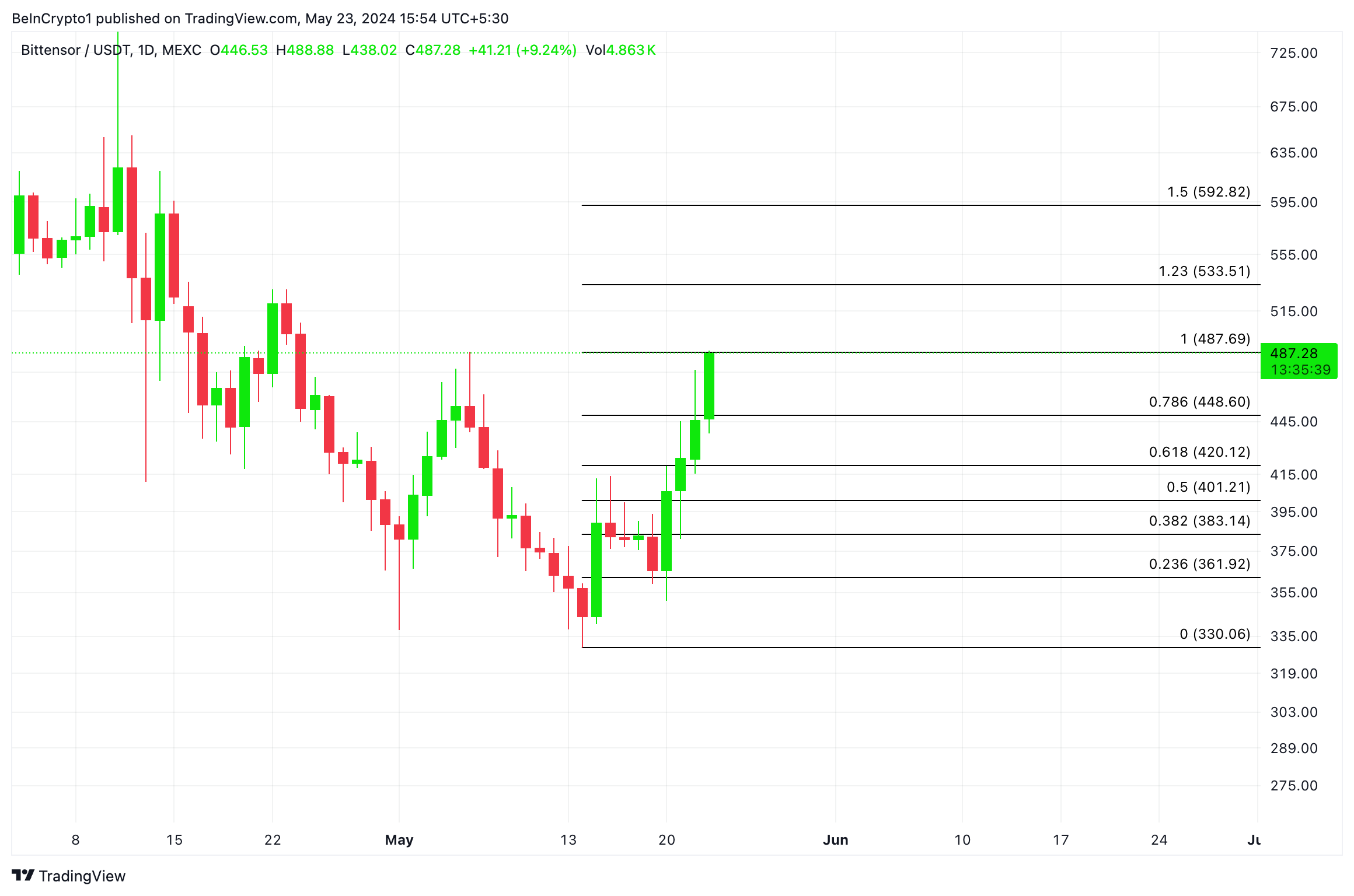 Sponsored SponsoredAls de bulls deze trend kunnen vasthouden en de accumulatie blijft toenemen, kan de TAO koers voorbij $500 stijgen en richting $592,82 bewegen.