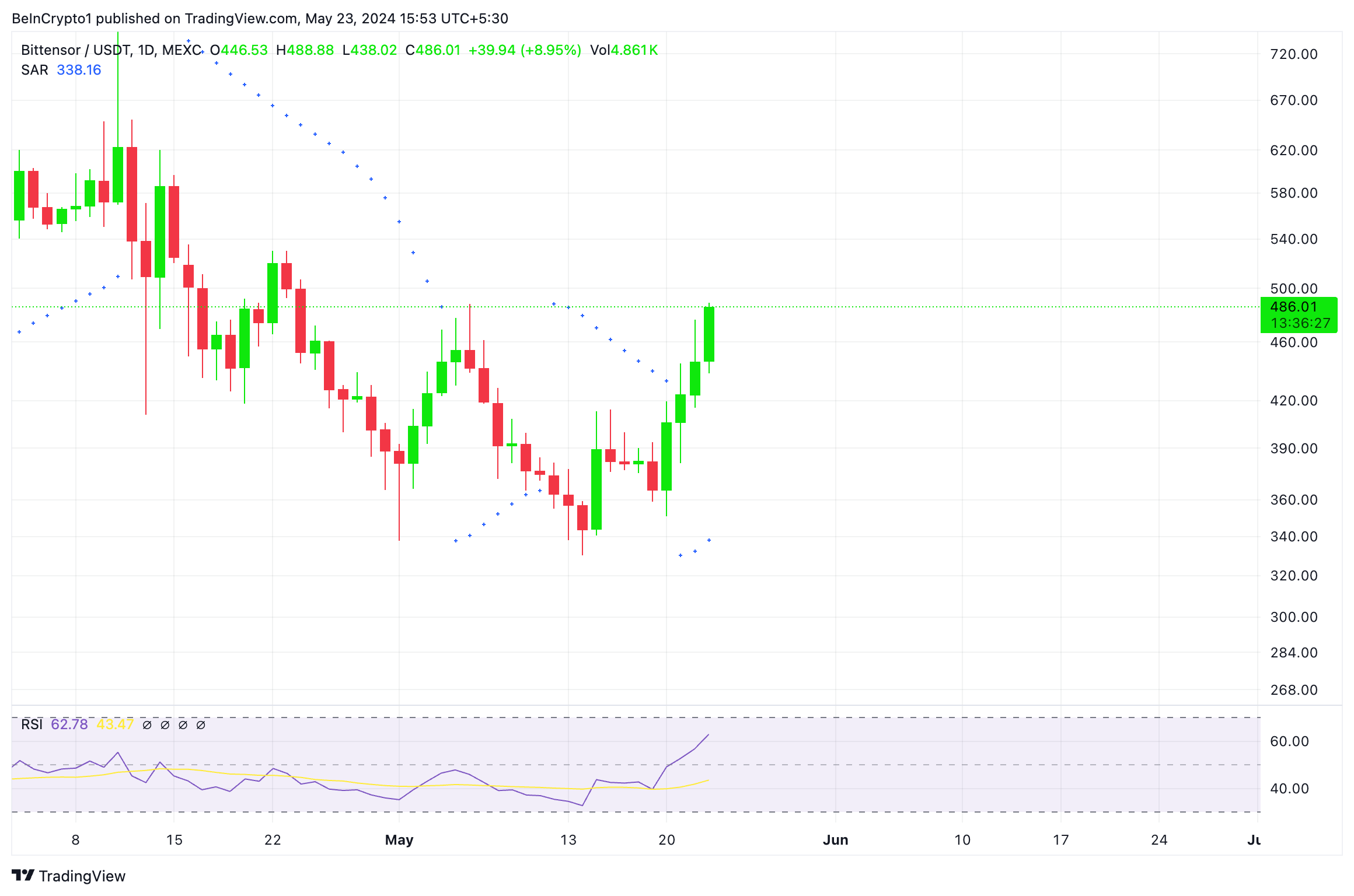 Ten eerste lieten de metingen van TAO’s Parabolic SAR-indicator zien dat de dots onder de koers rusten. Deze indicator meet de potentiële trendrichting en omkeringen van de token.