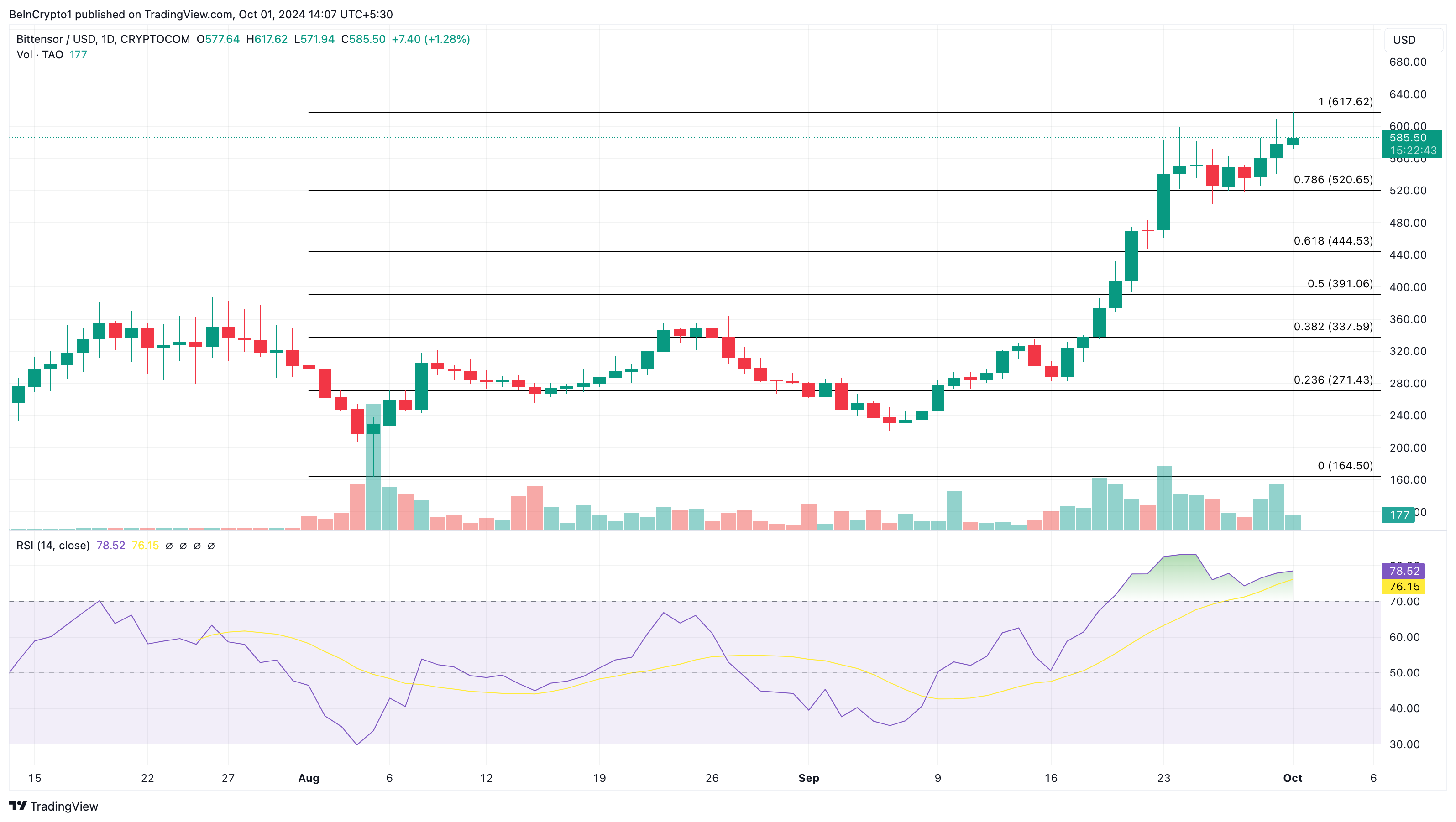 In september steeg de koers van Bittensor (TAO) met 111%, van $264 naar $587. Echter, nu oktober begint, suggereren verschillende indicatoren dat de koers van TAO weerstand kan ondervinden, wat verdere winsten mogelijk beperkt.