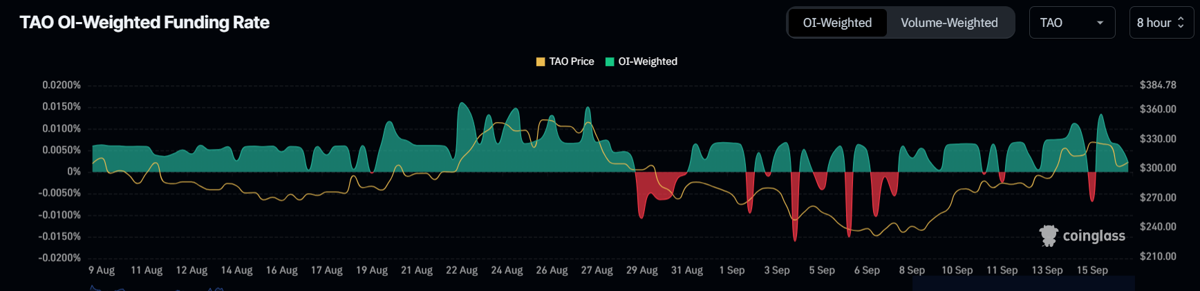 Daarnaast vertoont het algehele momentum voor Bittensor aanzienlijke kracht, vooral wanneer we de funding rate in ogenschouw nemen. Recente data laten zien dat longcontracten de shorts overheersen, wat aangeeft dat handelaren een verdere koersstijging voorzien. De positieve funding rate is een duidelijk teken van een bullish marktsentiment, met verwachtingen van een aanhoudende uitbraak op de korte termijn.