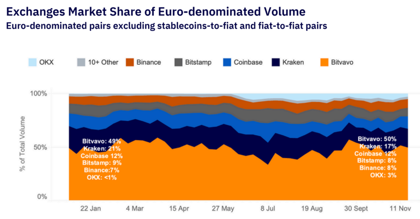 Het rapport, dat de eerste 11 maanden van dit jaar dekt, laat zien dat de in Amsterdam gevestigde crypto exchange goed is voor de helft van het wereldwijde handelsvolume in euro’s.