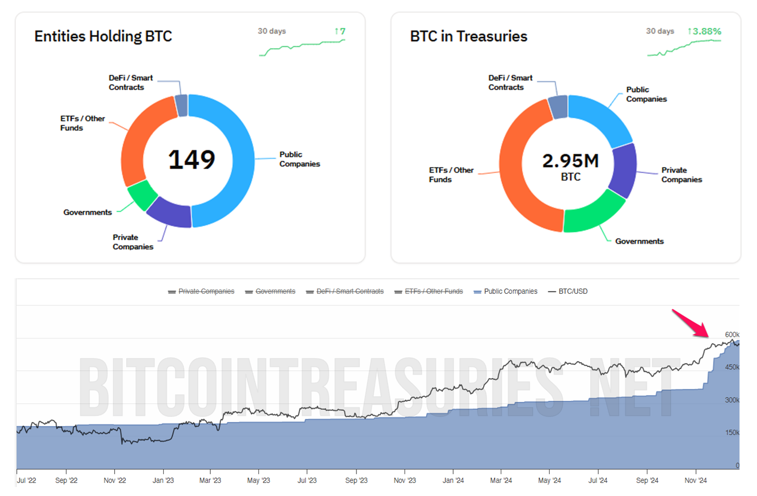 Op basis van gegevens van BitcoinTreasuries zijn beursgenoteerde bedrijven verantwoordelijk voor 49% (73 van de 149) van alle entiteiten die momenteel Bitcoin aanhouden. Bovendien is de hoeveelheid BTC die door beursgenoteerde bedrijven wordt aangehouden in de afgelopen twee maanden alleen al met 60% gestegen. Op dit moment houden deze bedrijven gezamenlijk 587.687 BTC aan, wat 20% vertegenwoordigt van de totale Bitcoin die door alle entiteiten wordt aangehouden.