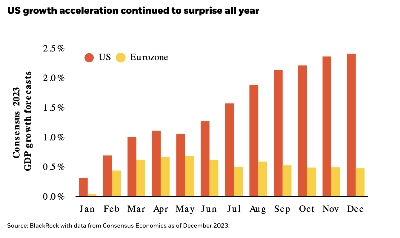 “De veelbesproken “harde landing vs. zachte landing” voor de Amerikaanse economie bleek geen landing te zijn – of misschien zelfs een take-off. De Amerikaanse bbp-groei versnelde het hele jaar door en overtrof voortdurend de verwachtingen”, aldus BlackRock.