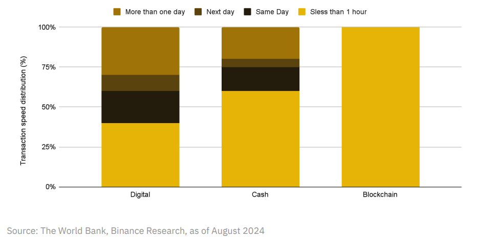 In tegenstelling tot blockchain-transacties, die vaak binnen een uur worden afgehandeld, zelfs voor internationale uitwisselingen.