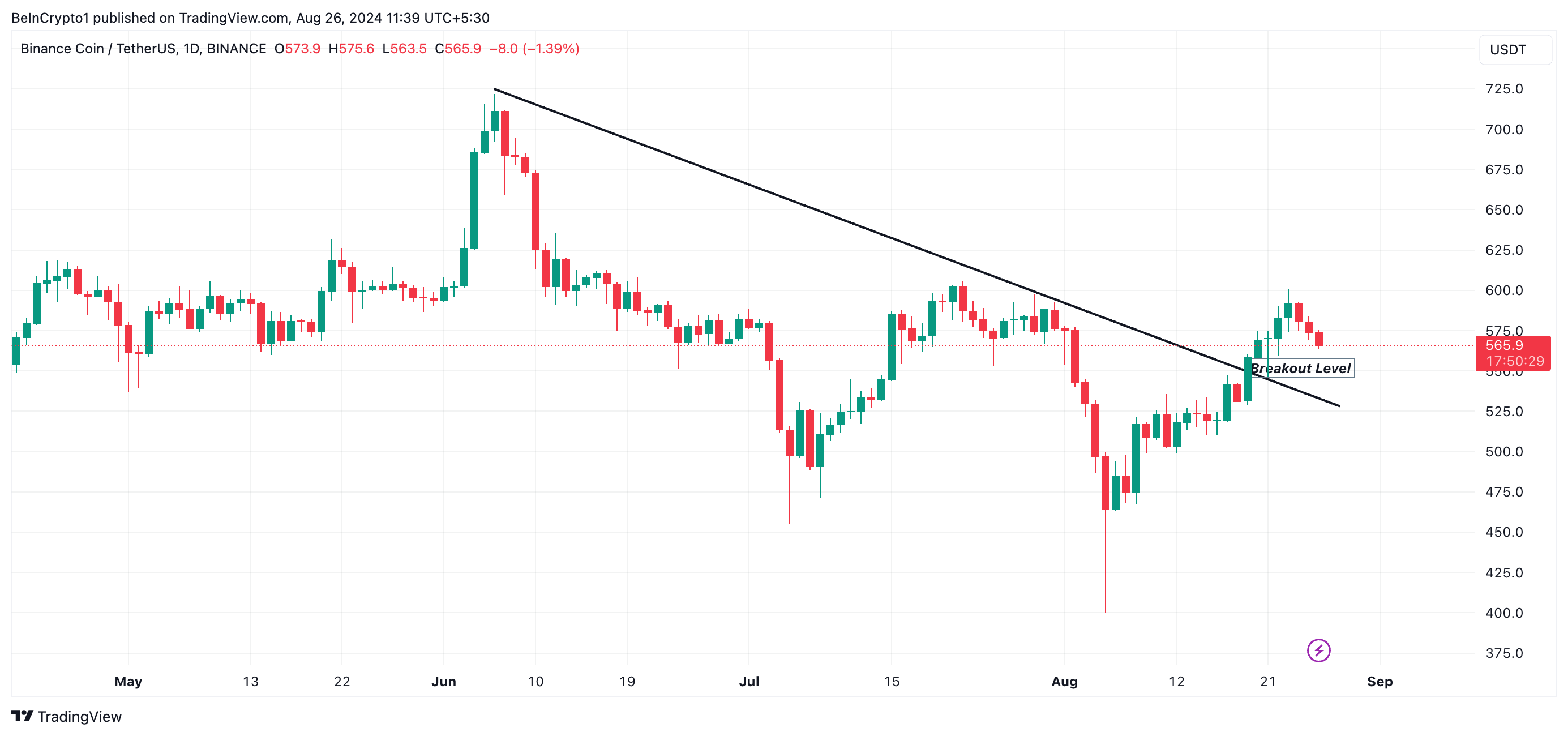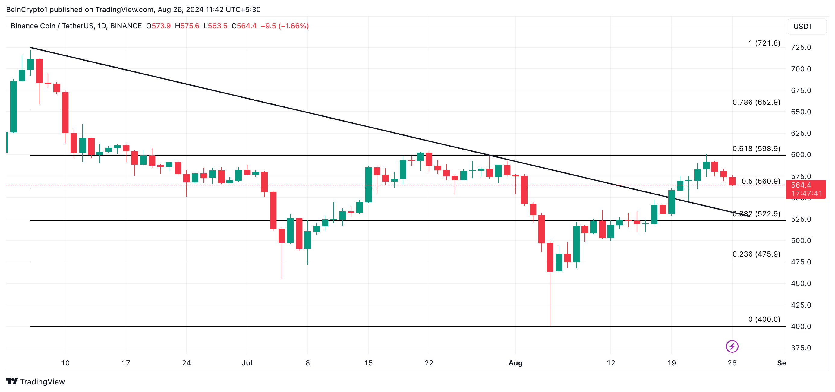 Binance Coin (BNB) heeft moeite om zijn recente uitbraak boven een dalende lijn te consolideren. De altcoin heeft een terugval gezien sinds zijn piek op $599 op 23 augustus.