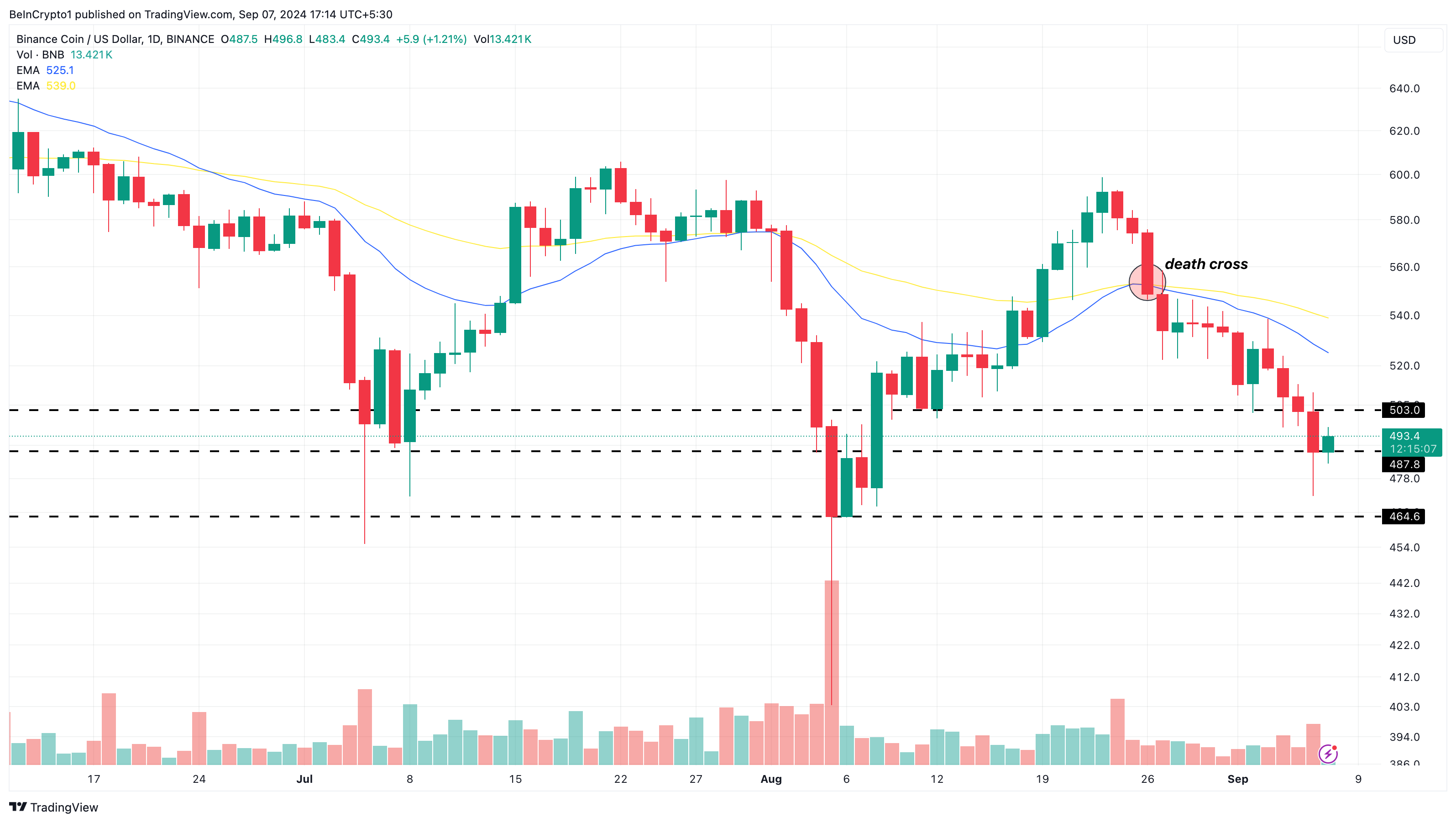 Op de dagelijkse BNB/USD-tijdlijn probeerden bulls de steun op $503 te verdedigen, maar bears weerstonden uiteindelijk toen de koers daalde naar $494. Een blik op de Exponential Moving Average (EMA) toonde de vorming van een death cross.