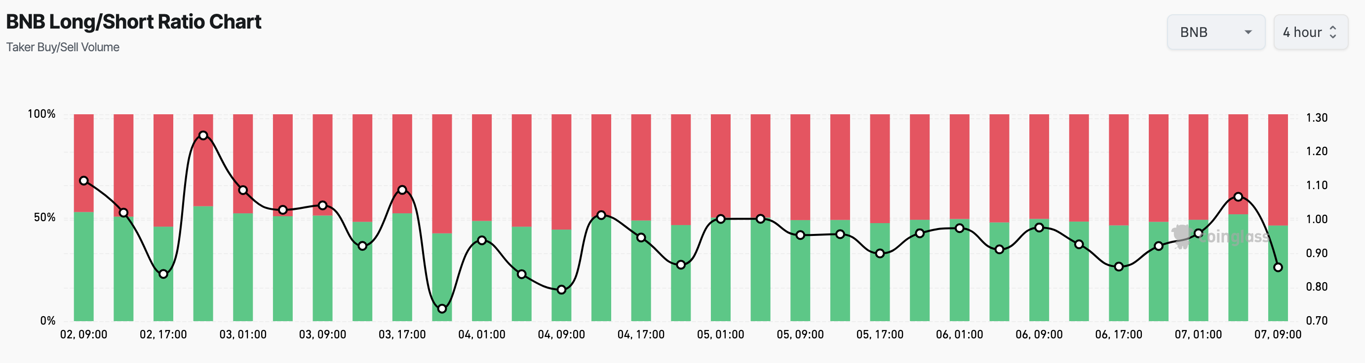 Aan de andere kant wedden 46% van de BNB handelaren op een koersstijging. Een Long/Short ratio boven 1 suggereert dat meer handelaren longposities innemen, anticiperend op een koersstijging.