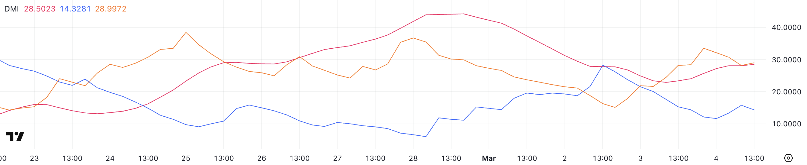 De +DI (Positive Directional Indicator) is gedaald naar 14,3, van 28,2 twee dagen geleden, wat aangeeft dat het bullish momentum aanzienlijk is verzwakt.