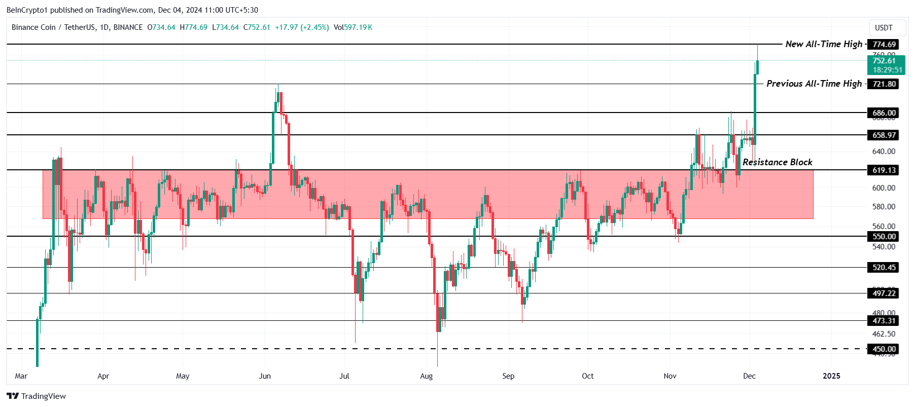BNB koers heeft een aanzienlijke stijging doorgemaakt en een nieuwe all-time high (ATH) bereikt na zes maanden van weerstand. Deze recente koersactie markeert een cruciale verschuiving voor de cryptocurrency, die zich heeft losgemaakt van de acht-maandse weerstandzone tussen $572 en $619.