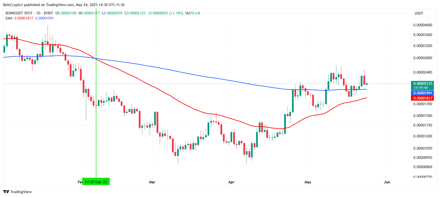 Technische analyse laat zien dat BONK een Golden Cross nadert, aangezien de 50-daagse EMA bijna de 200-daagse EMA inhaalt. Deze kruising wordt algemeen beschouwd als een sterk bullish signaal, dat vaak opwaarts momentum veroorzaakt.