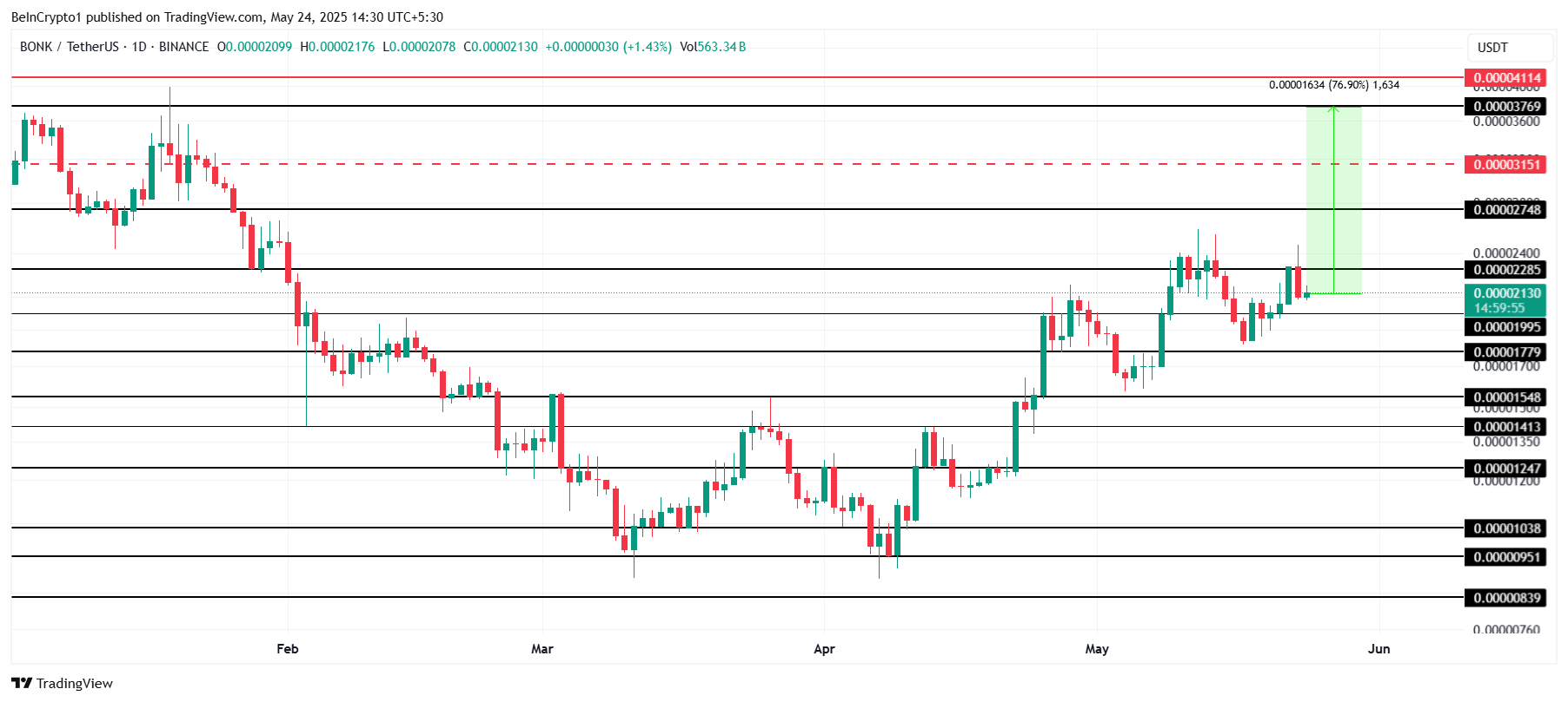 Momenteel handelt BONK op $0,00002130 en ondervindt weerstand op $0,00002285. Om de verliezen sinds het begin van 2025 volledig te herstellen, moet BONK ongeveer 77% stijgen, tot $0,00003769.
