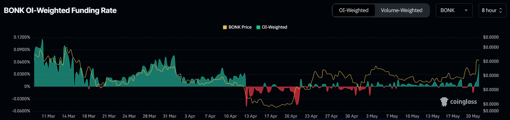 De Bonk koers neemt de impact waar van de stijgende marktgroei en het optimisme van BONK-holders. Dit laatste is duidelijk zichtbaar in de funding rate van de meme coin, die een 2-maandelijkse high heeft bereikt.