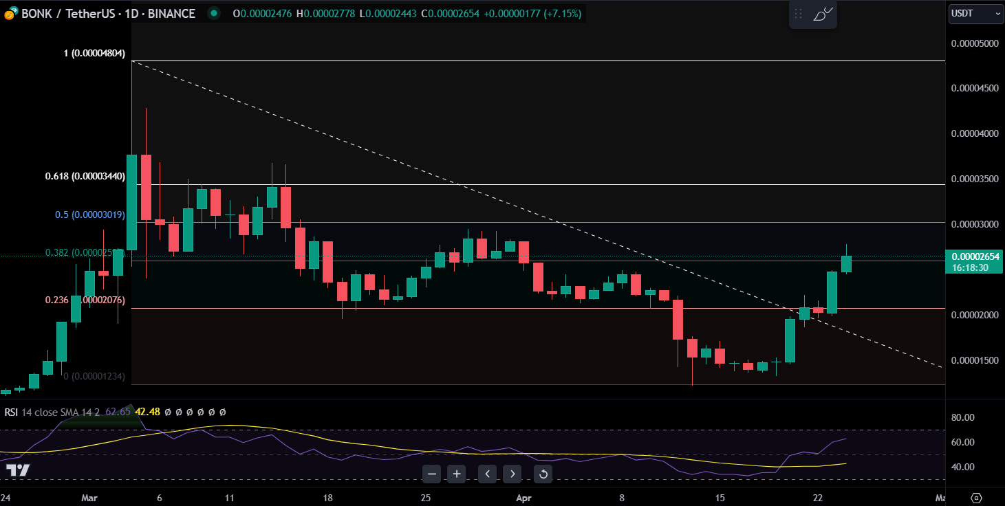 Op woensdag steeg de BONK waarde naar $0,00002753, waarmee de cryptomunt zijn hoogste koers sinds begin april bereikte.