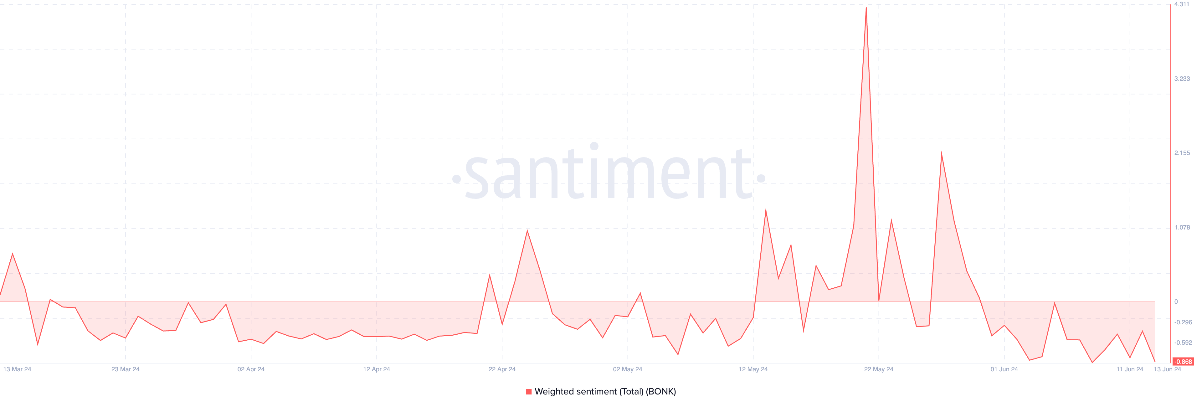 Het bearish sentiment dat BONK volgt, wordt bevestigd door het negatieve gewogen sentiment. Deze on-chain statistiek heeft sinds 30 mei alleen negatieve waarden geretourneerd. Op het moment van schrijven is het -0,86.