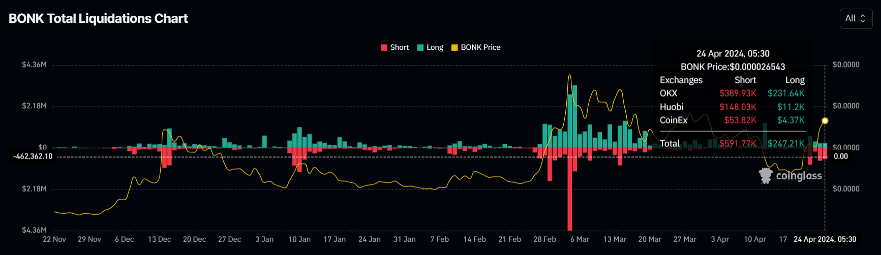 Shortposities ter waarde van meer dan $2 miljoen werden de afgelopen vier dagen geliquideerd. Terwijl de koers steeg, werden de short-contracten die anticipeerden op een verdere daling van de waarde van de altcoin vereffend en verkocht.