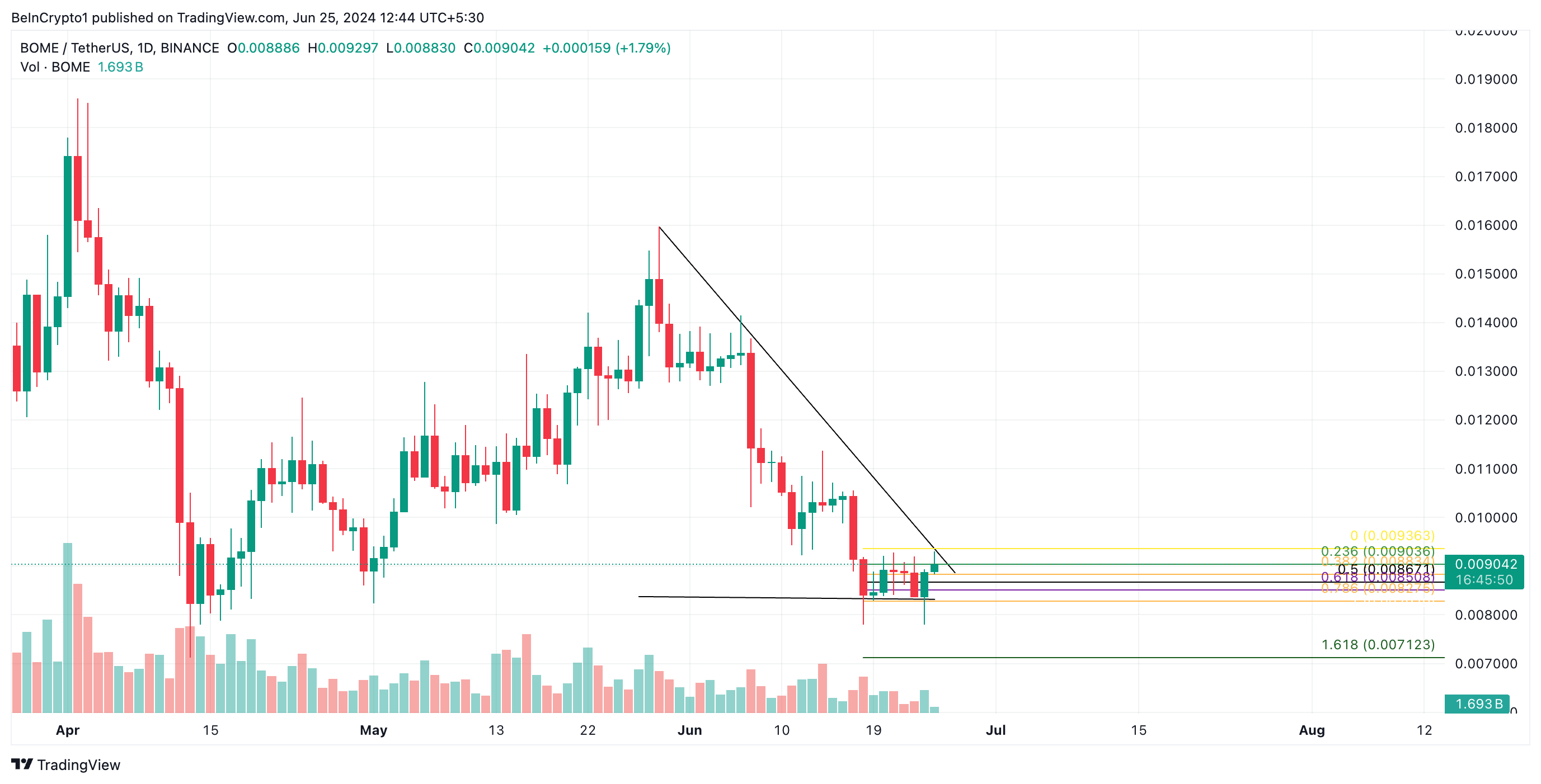 De neerwaarts hellende trendlijn vertegenwoordigt weerstand, terwijl de horizontale lijn steun vormt. In het geval van BOME stuitte het op weerstand bij $0,015 en vond het steun bij $0,008.
