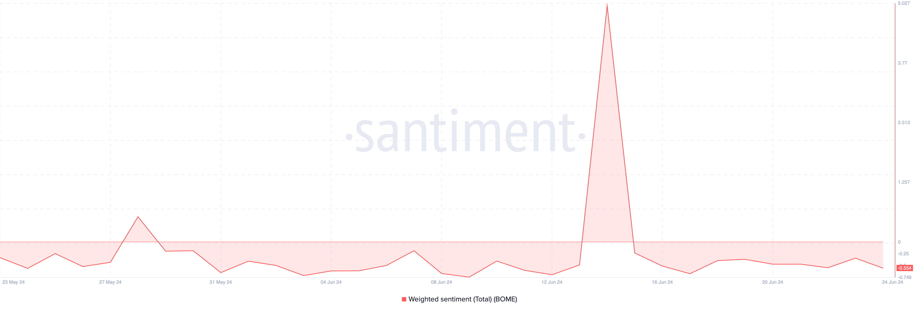 Hoewel BOME de afgelopen week een kleine opleving liet zien en klaar lijkt om boven de weerstand te handelen, is het bearish sentiment ten opzichte van BOME nog steeds sterk.